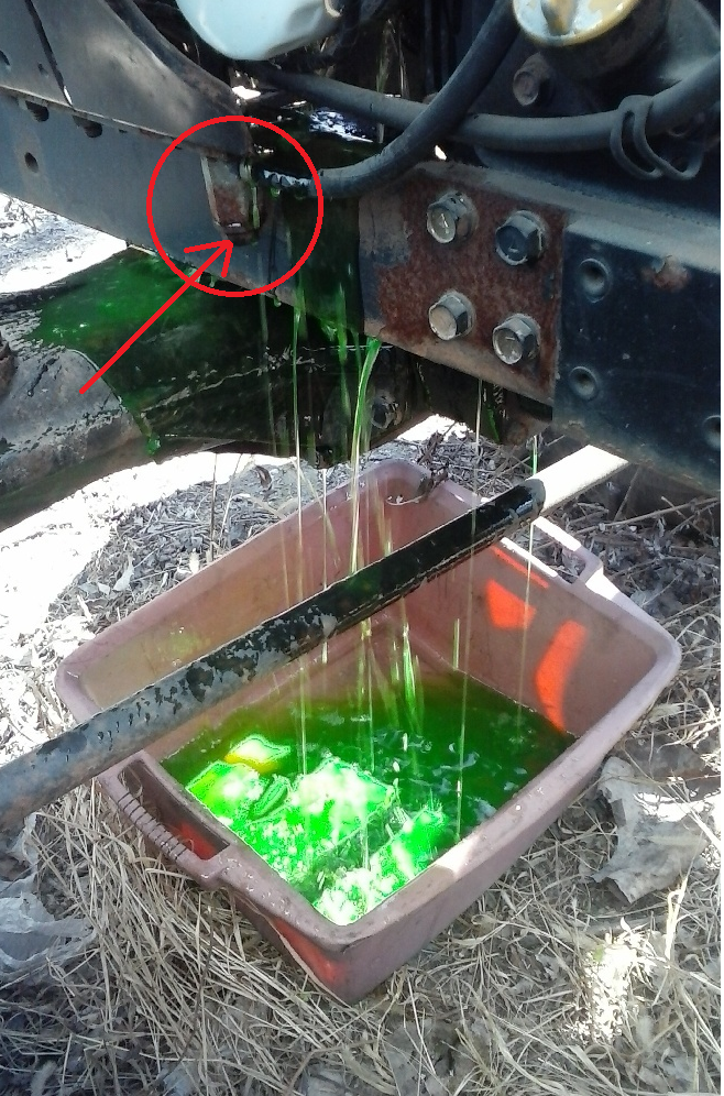 Płyn chłodnicy ścieka do kuwety po odpięciu węża.