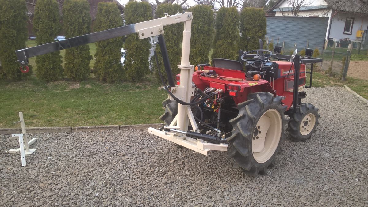 Żuraw rozwija skrzydła dzięki dołożeniu silownika obrotu ramienia i wciągarki 1,2t. Najważniejsze ,że żuraw zapięty na tylnym podnośniku pasuje do przyczepki i można przemieszczać się razem. Załadunek przyczepki może odbywać się w ograniczonym zakresie bez konieczności odpinania. Żeby w pełni wykorzystać możliwości żurawia przyczepę należy odpiąć.