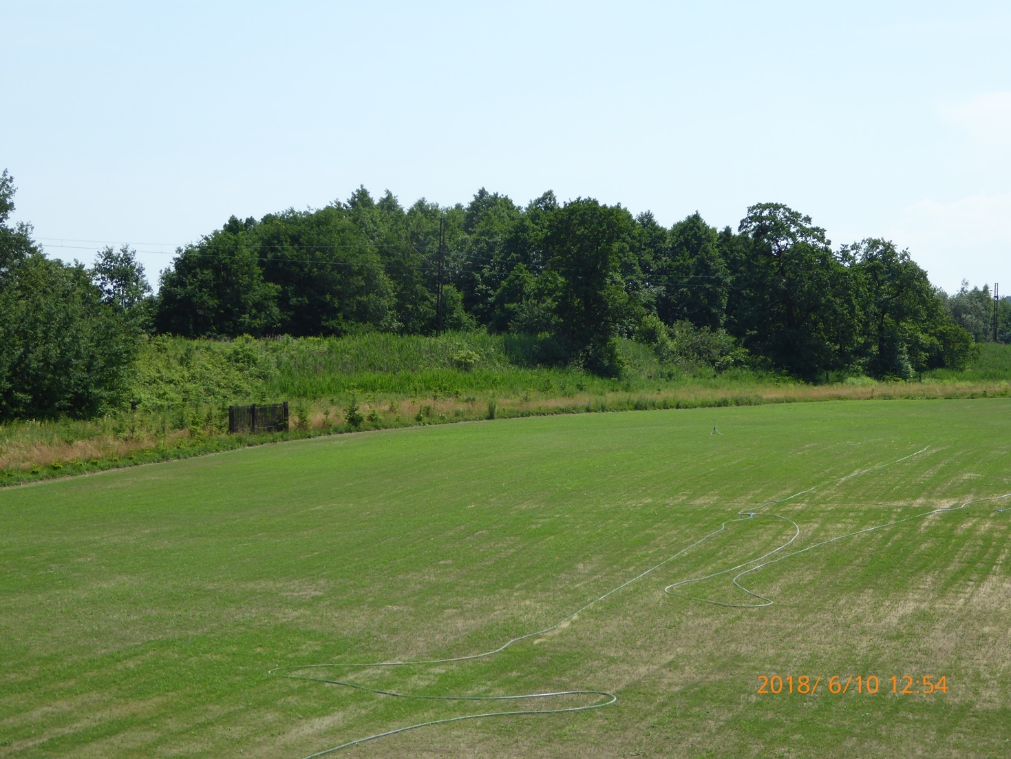 Po tym wszystkim popatrzyłem na prognozę pogody i od razu decyzja o podłączeniu 4 zraszaczy, które od popołudnia soboty 26 maja rozpoczęły swoją pracę z nawadnianiem całego terenu. Dało to efekt bo już we wtorek pokazały się pierwsze kiełki a trawę sialiśmy w piątek po południu. Słońce i hektolitry wody zrobiło swoje- po tygodniu w piątek było już widać z daleka duże zielone „placki”. Teraz dalej pryskamy wodą ale już w mniejszych ilościach żeby nie przesadzić z wilgocią. Zresztą słońce też już trochę zelżało i już nie praży jak w pierwszym tygodniu. Najgorsze w tym wszystkim jest to, że nie mogę tego obserwować z bliska bo musiałem polecieć do pracy